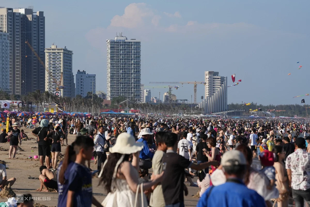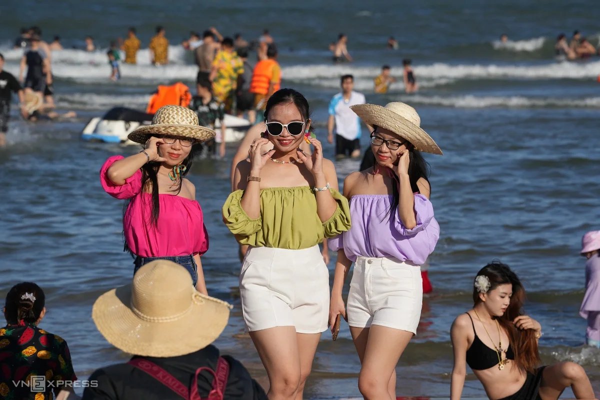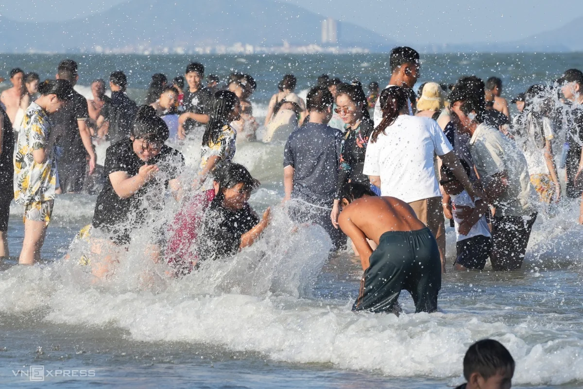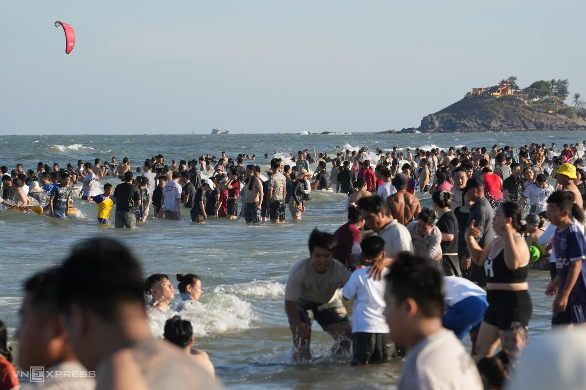 Bãi Sau, phường Vũng Tàu dài hơn 3 km đông nghịt người chiều 30/4. Những ngày này khu vực Đông Nam Bộ duy trì nền nhiệt cao, phổ biến 34-36 độ, có nơi nắng gay gắt từ trưa đến chiều. Thời tiết oi bức khiến lượng lớn người dân từ trung tâm TP HCM, Đồng Nai, Tây Ninh… đổ về Vũng Tàu để tắm biển ngay ngày đầu kỳ nghỉ lễ.